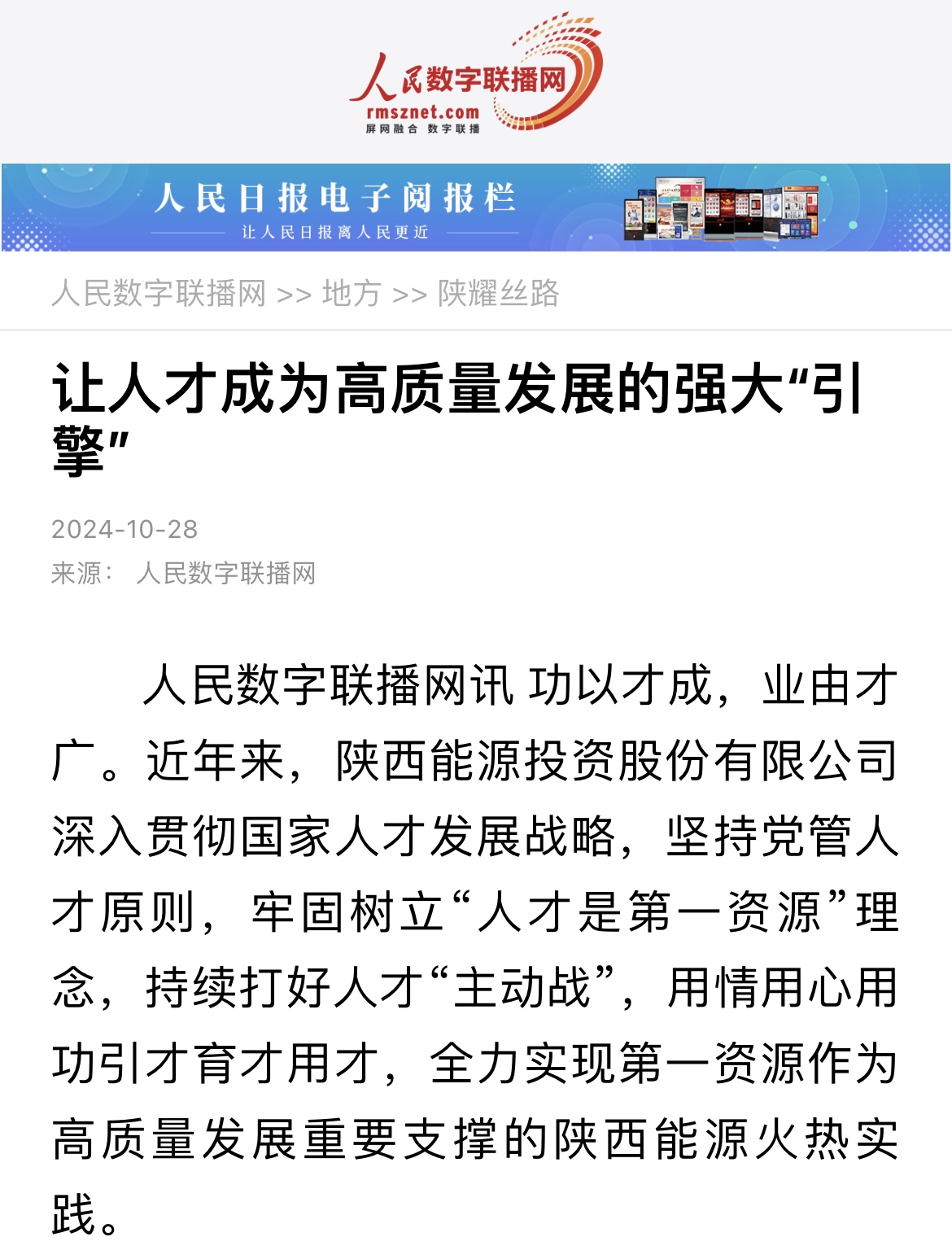 編者按:在當今快速發展的知識經濟時代,人才已成為企業發展的核心資源和原動力。《陜西能源:讓人才成為高質量發展的強大“引擎”》一文,闡述了陜西能源投資股份有限公司如何將人才戰略融入企業發展的各個環節,以及如何通過人才的引進、培養和激勵,為公司的高質量發展提供強有力的“人才支撐”,在人民數字聯播網、陜西國資、陜西投資等多個平臺刊登,收到了廣泛關注和好評。