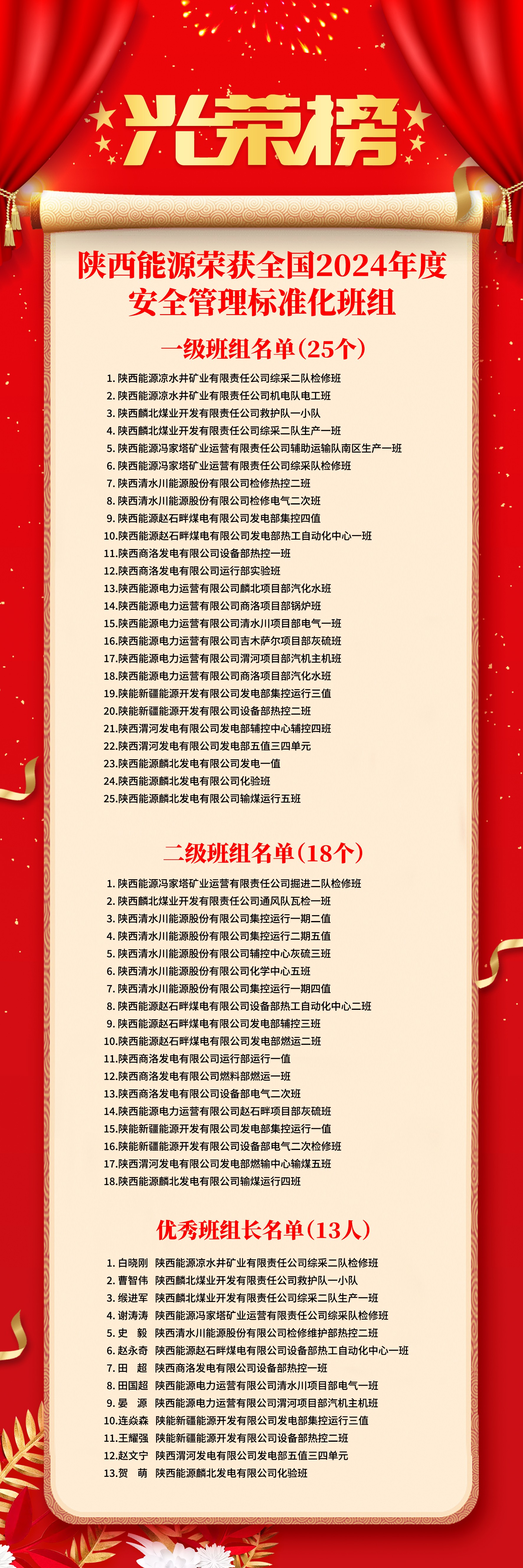 甲辰冬月,陜西能源在全國安全管理標準化班組創(chuàng)建活動中再創(chuàng)佳績。2024年12月20日,中國安全生產協會通報榮獲2024年度安全管理標準化班組一級班組370個、二級班組490個及優(yōu)秀班組長285人獲獎名單,其中陜西能源權屬企業(yè)有25個一級班組(在全國一級班組中占比6.8%)、有二級班組18個、有13個優(yōu)秀班組長(具體名單見后)。