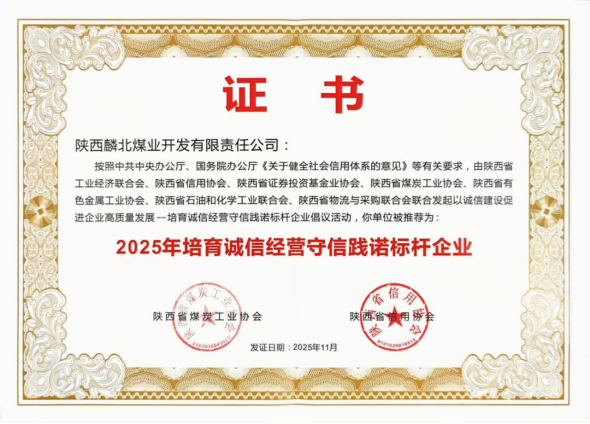 11月21日,麟北煤業(yè)被陜西省煤炭工業(yè)協(xié)會(huì)和陜西省信用協(xié)會(huì)聯(lián)合推薦為2025年培育誠信經(jīng)營守信踐諾標(biāo)桿企業(yè)。這一榮譽(yù)標(biāo)志著公司在誠信建設(shè)和合規(guī)經(jīng)營方面獲得了行業(yè)高度認(rèn)可。