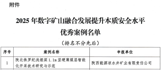 近日,2025年數(shù)字礦山融合發(fā)展提升本質(zhì)安全水平典型案例名單正式公布,涼水井礦業(yè)《陜北侏羅紀(jì)淺埋深1.1m 堅(jiān)硬薄煤層智能化開采技術(shù)研究與示范》項(xiàng)目成功入選。