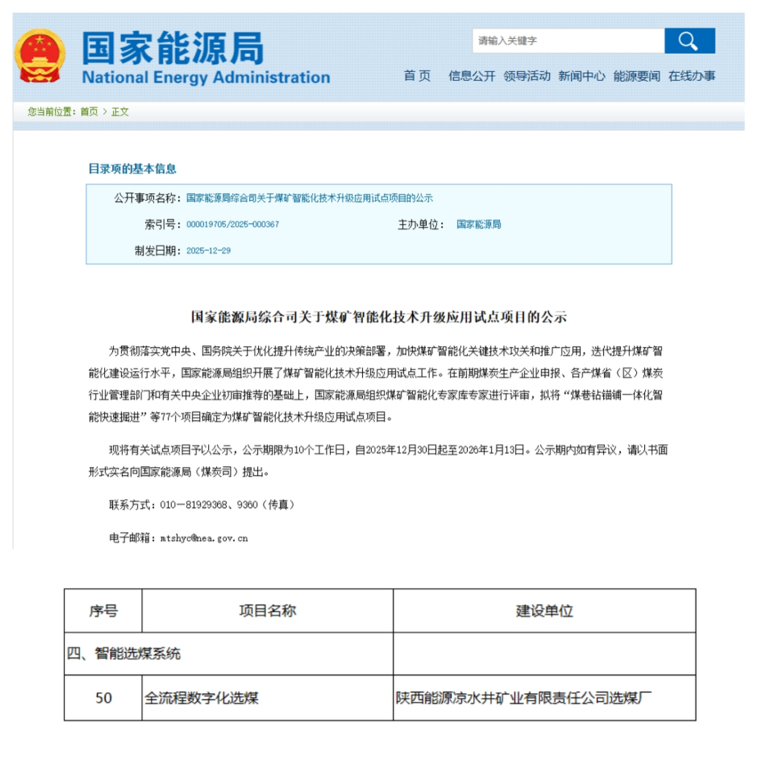 近日,國家能源局綜合司公布煤礦智能化技術升級應用試點項目,涼水井礦業(yè)《全流程數(shù)字化選煤》項目成功入選,標志著公司選煤智能化建設成果獲國家級認可。