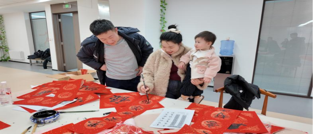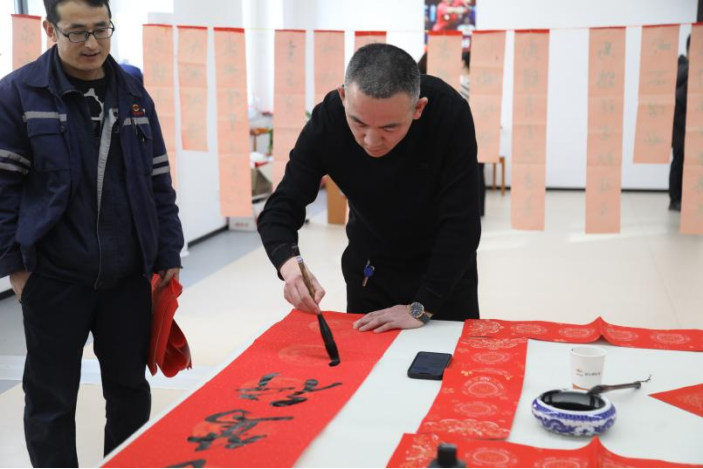 春聯書寫區里,眾人圍立桌旁,欣賞書法老師筆走龍蛇的精湛技藝,一幅幅寓意吉祥的礦山特色春聯、一個個遒勁有力的“福”字躍然紙上,現場贊嘆聲此起彼伏。大家還能按需現場“點單”,請老師書寫專屬春聯,寄托家庭美滿、事業順遂等美好心愿,不少職工及家屬也踴躍體驗毛筆創作,在筆墨書香中感受傳統書法的獨特魅力。