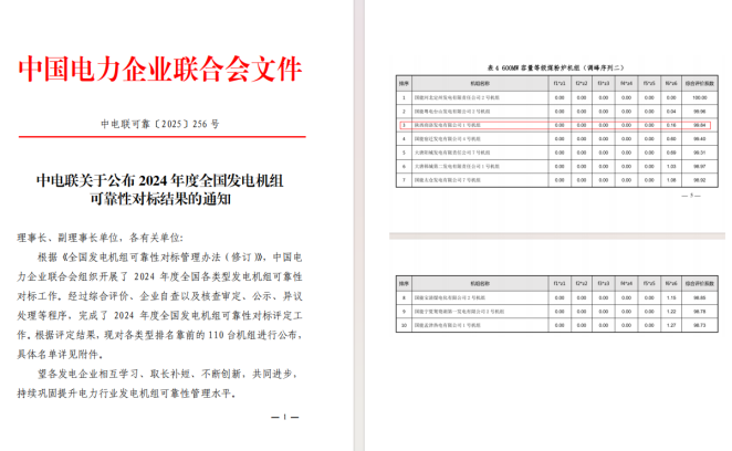 近日,中國電力企業(yè)聯(lián)合會公布了2024年度全國發(fā)電機組可靠性對標(biāo)結(jié)果,商洛發(fā)電一號機組以綜合評價系數(shù)99.84的優(yōu)異成績,位列600MW等級煤粉爐機組全國第三名。