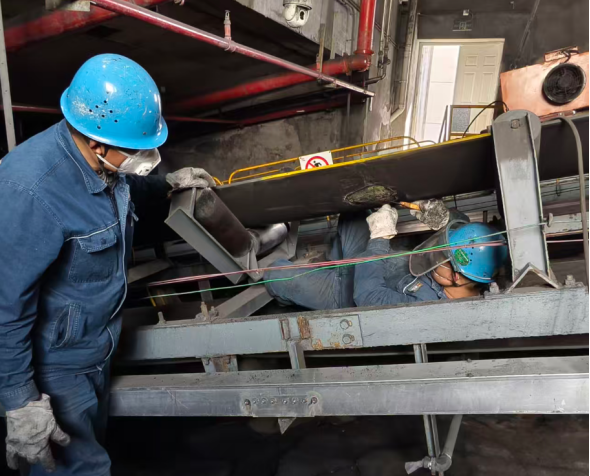在不足半米高的皮帶輸送架下,輸煤檢修班張保亮半躺在地、蜷縮身體,在彌漫的粉塵中仔細排查每一個連接點和磨損處。他目光如炬,緊盯著每一個細節,這個看似“躺平”的姿勢,恰恰是為了讓這條生產的“咽喉”要道順暢運行。